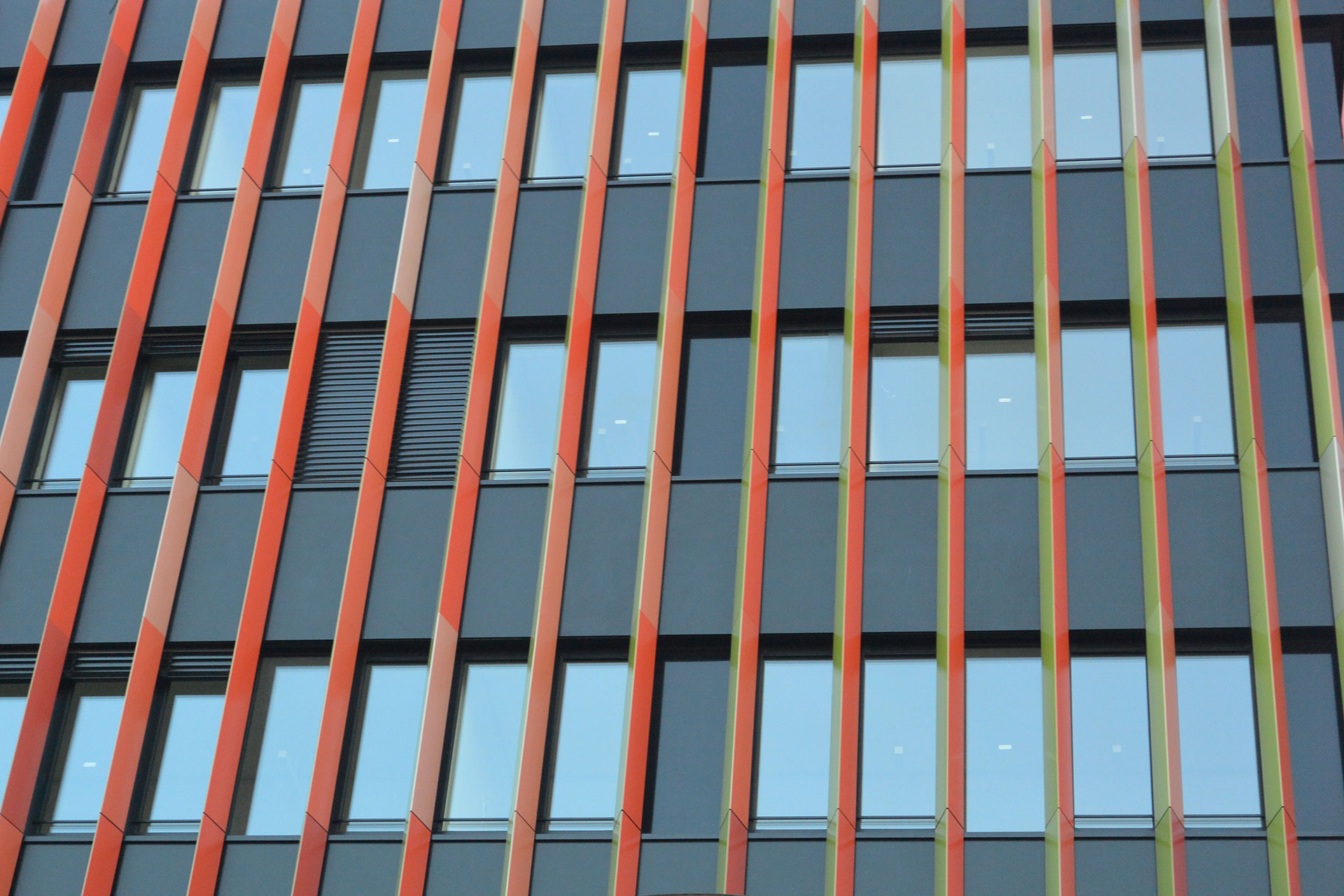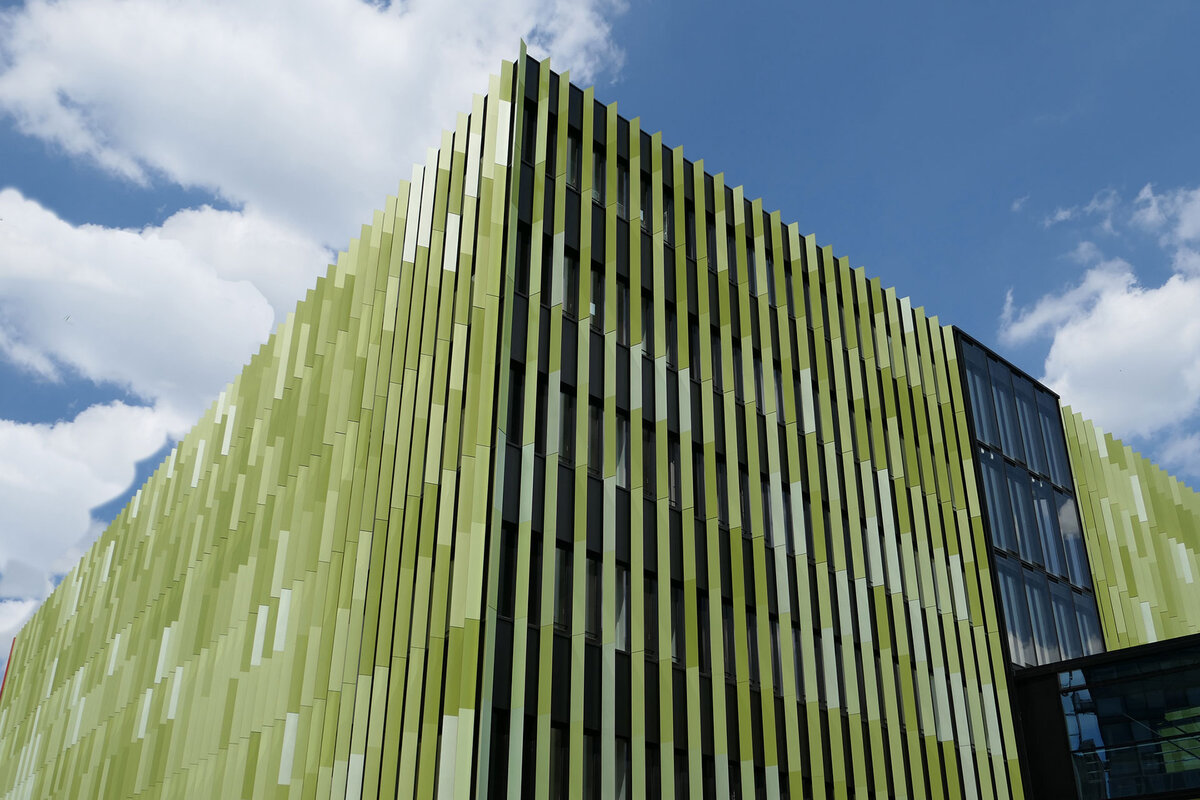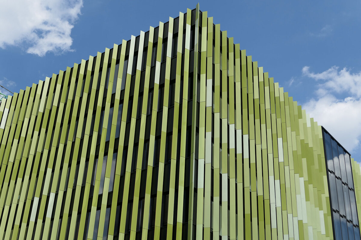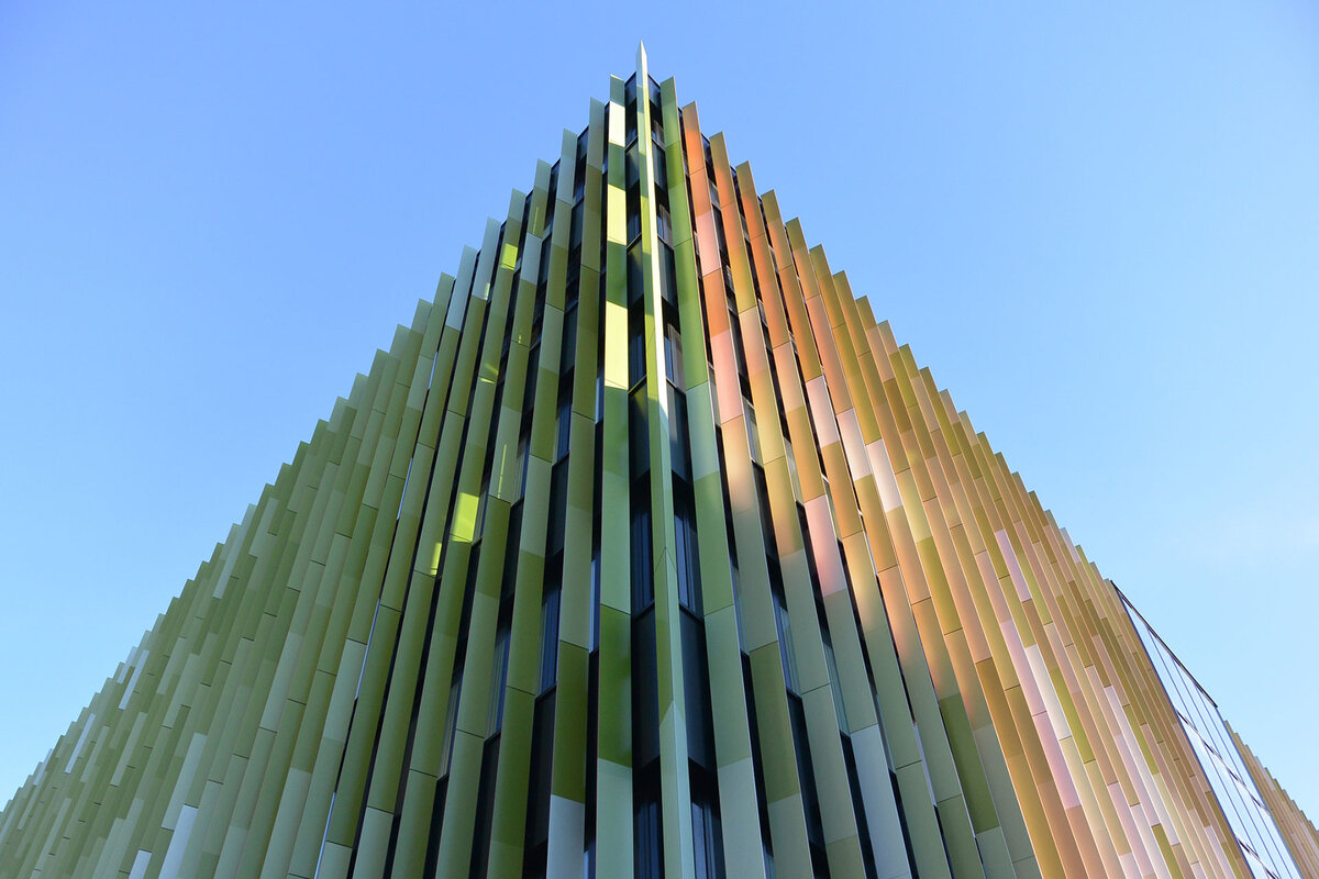 Fensterbänder mit vorgehängten starren dreieckigen Sonnenschutzprofilen in Lisenenform