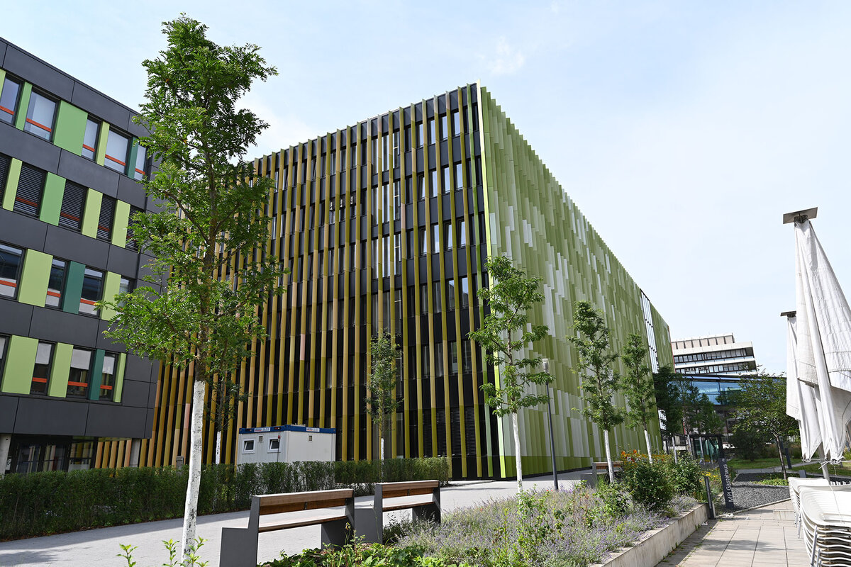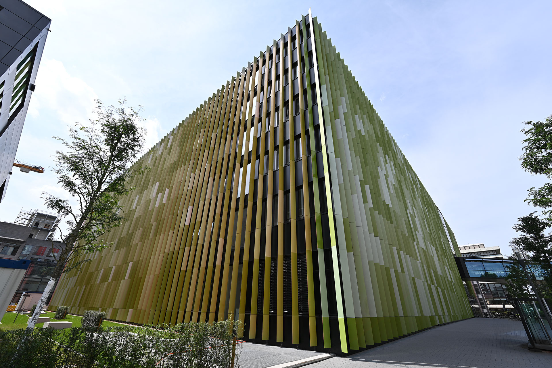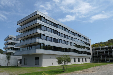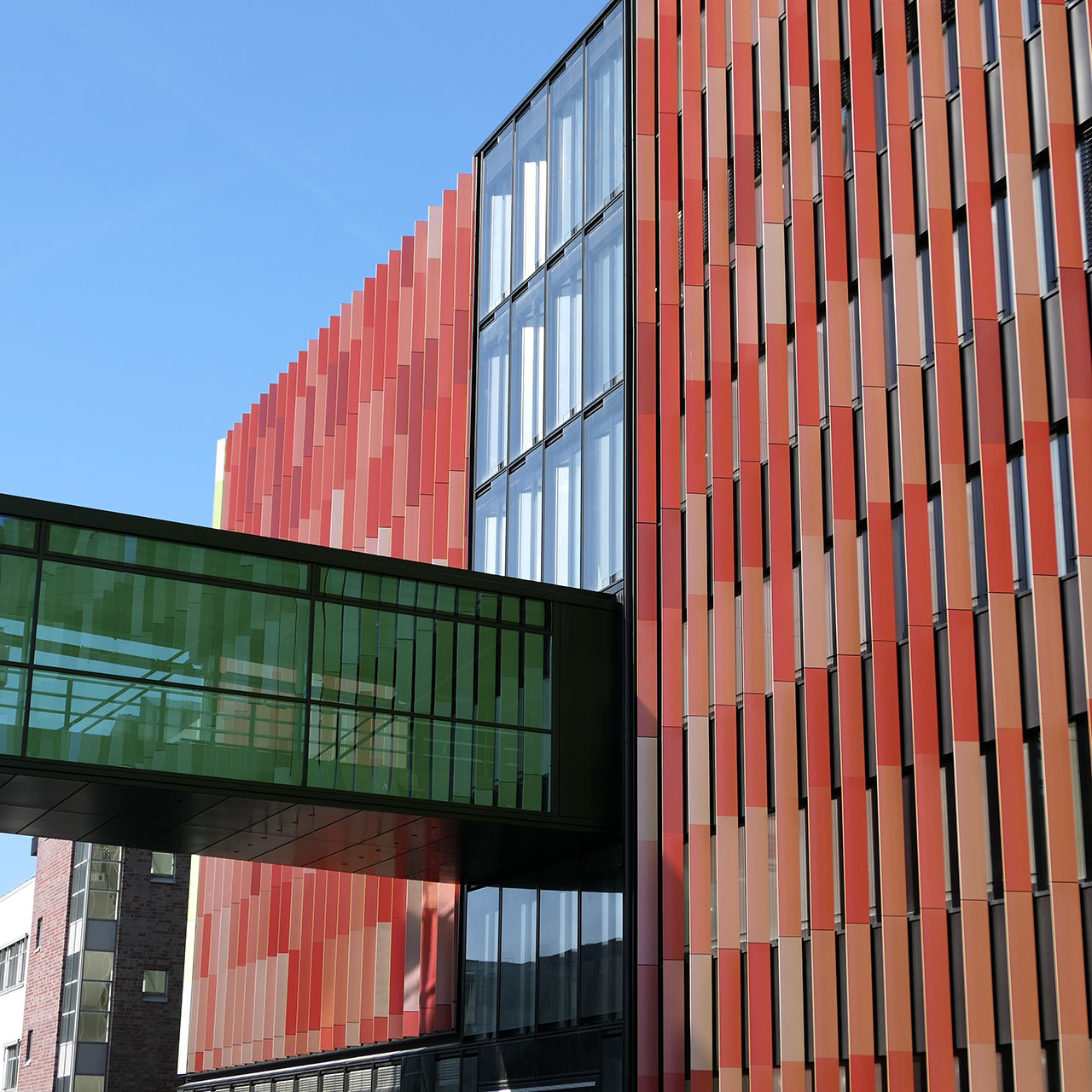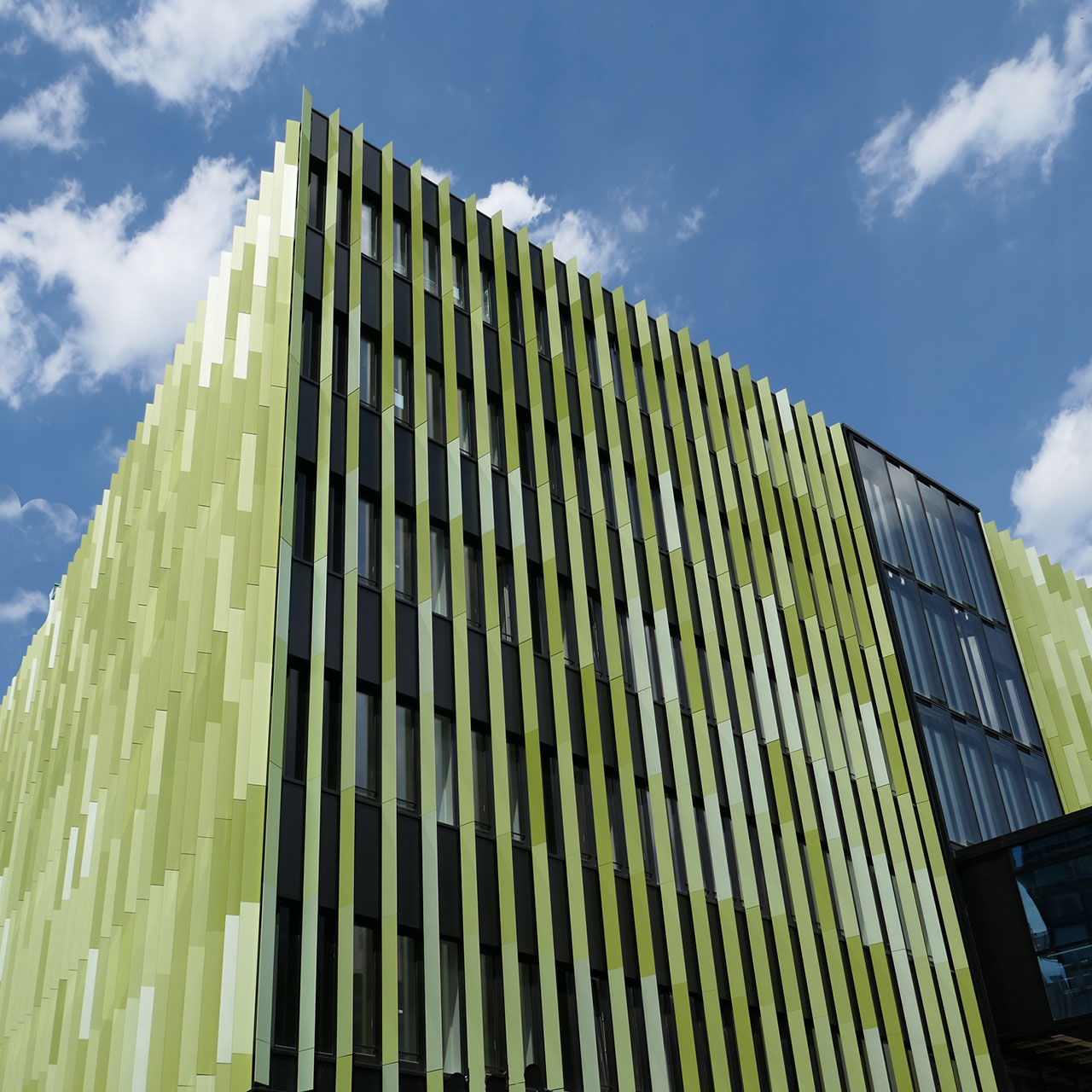 Fensterbänder mit vorgehängten starren dreieckigen Sonnenschutzprofilen in Lisenenform