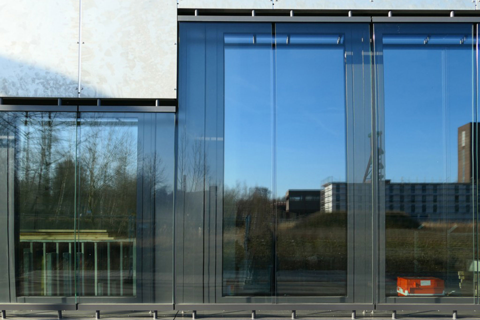 Fensterbandfassade mit Prallscheibe und hinterlüfteter ferverzinkter Stahl-Blechbekleidung