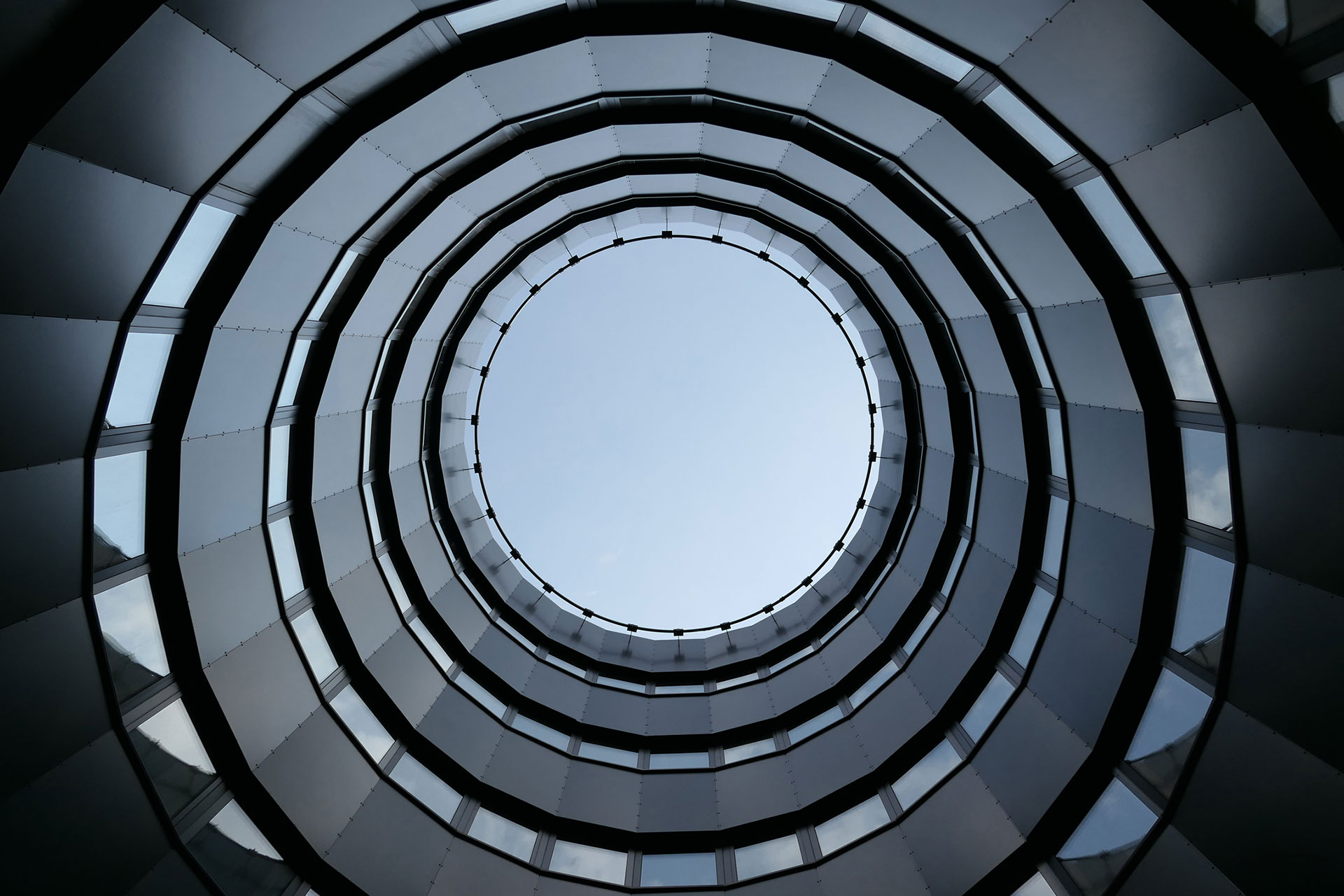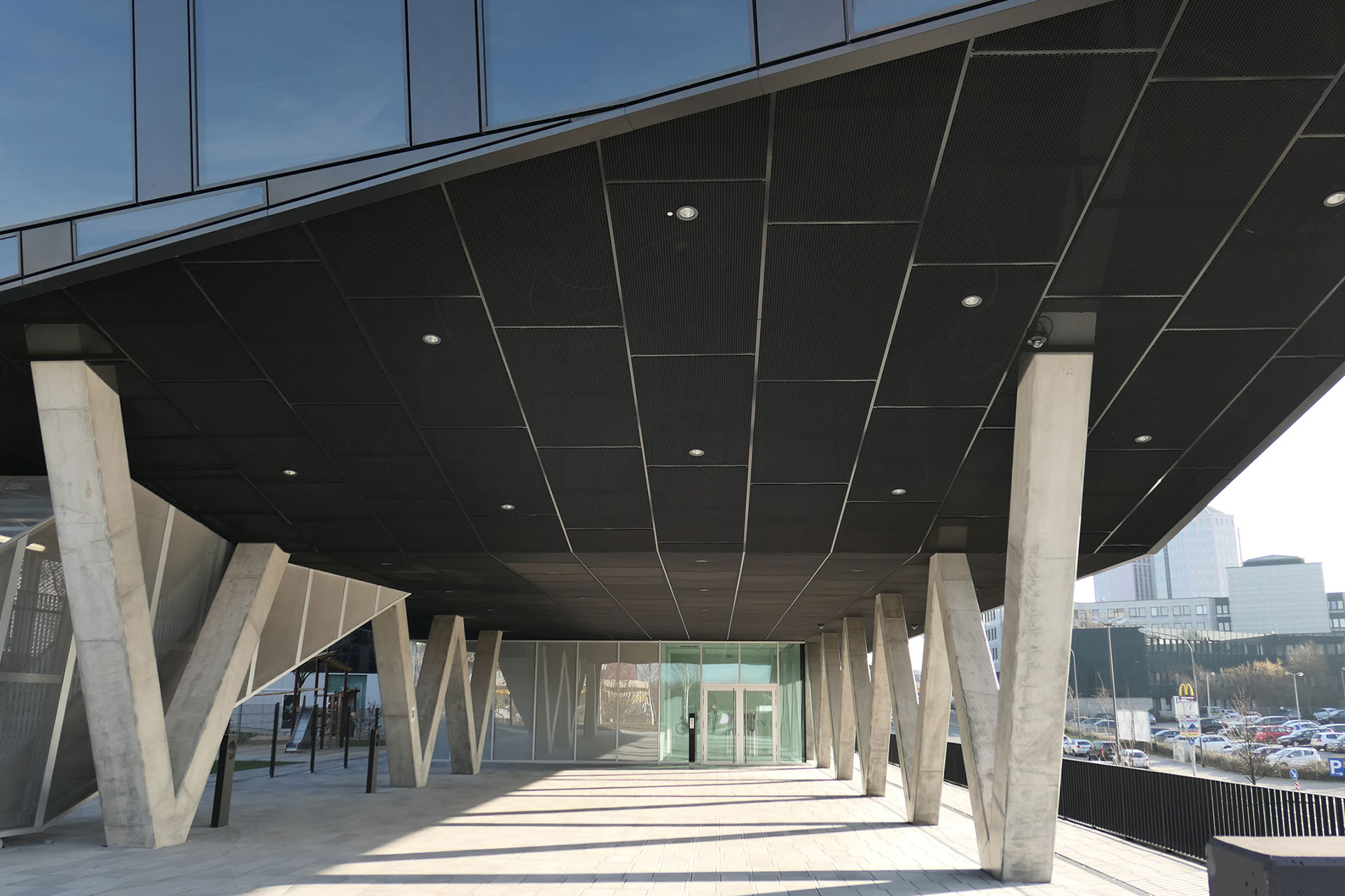 MH 2: polyganale Elementfassde mit polyganale Elementfassde mit Prallscheibe, polygonale Pfosten- Riegel-Fassade, polygoneles Fensterband und hinterlüftete Blechbekleidung