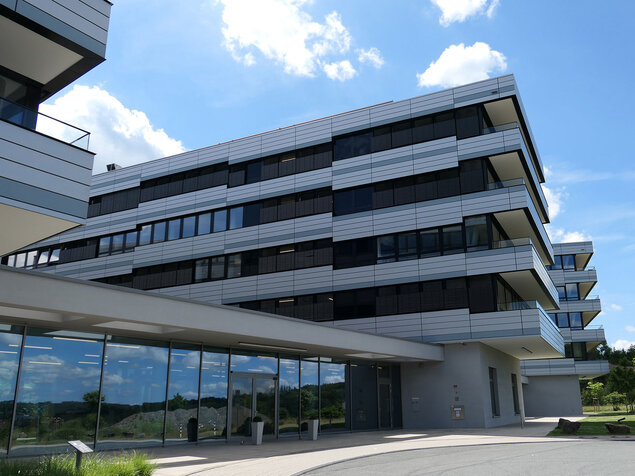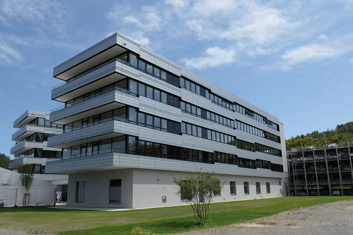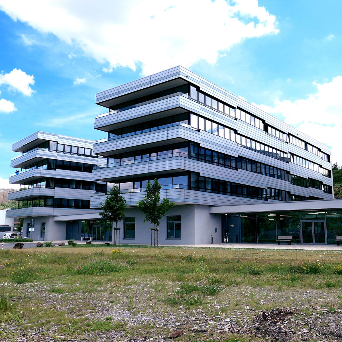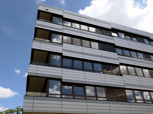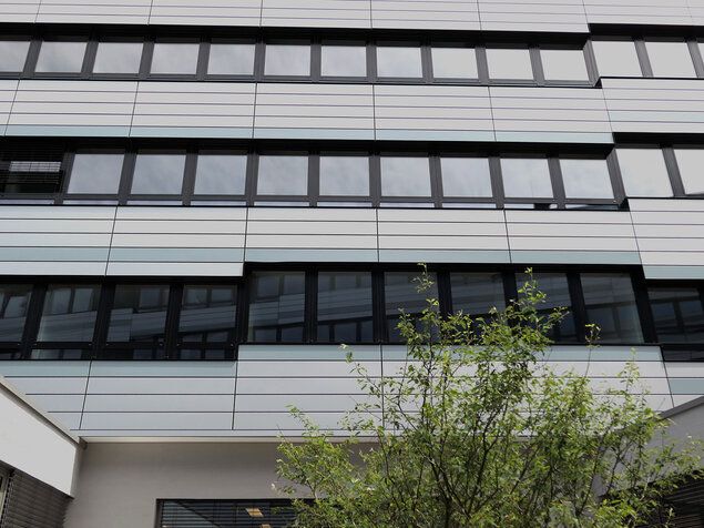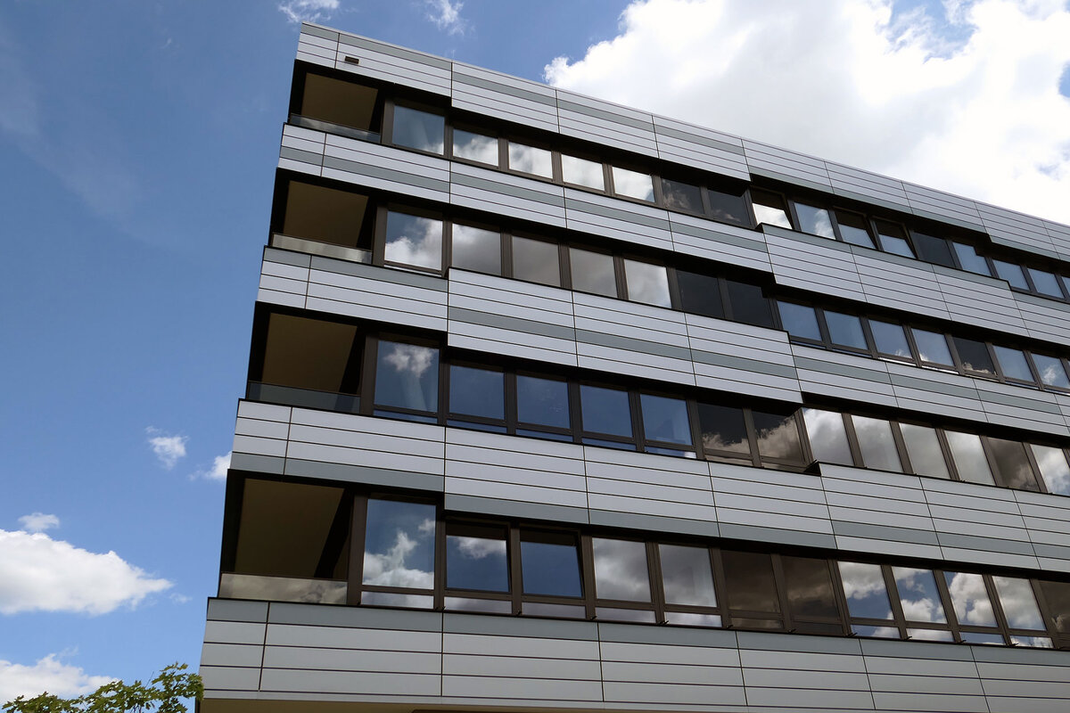 Fensterbandfassade mit hinterlüfteten Blechbekleidung, PR-Fassade